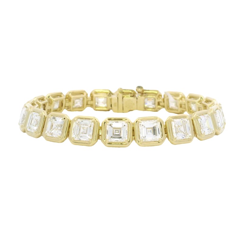 Rahaminov 18k Yellow Gold Illusion Bezel Set Asscher Cut Diamond Bracelet with 20 Ascher Cut Diamonds Totaling 20.10 Carats. Diamonds are I to J in Color and VVS1 to SI1 in Clarity. GIA Reports for all Stones Included.